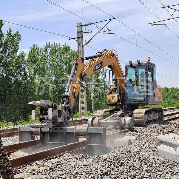 換枕機是一款鐵路養(yǎng)護設備,安裝到挖掘機上,可以更換不同的屬具進行換枕、換軌、道砟清篩等功能,使用挖掘機作底盤,在其前后加裝鋼制導向輪系統(tǒng)及液壓系統(tǒng),使挖掘機